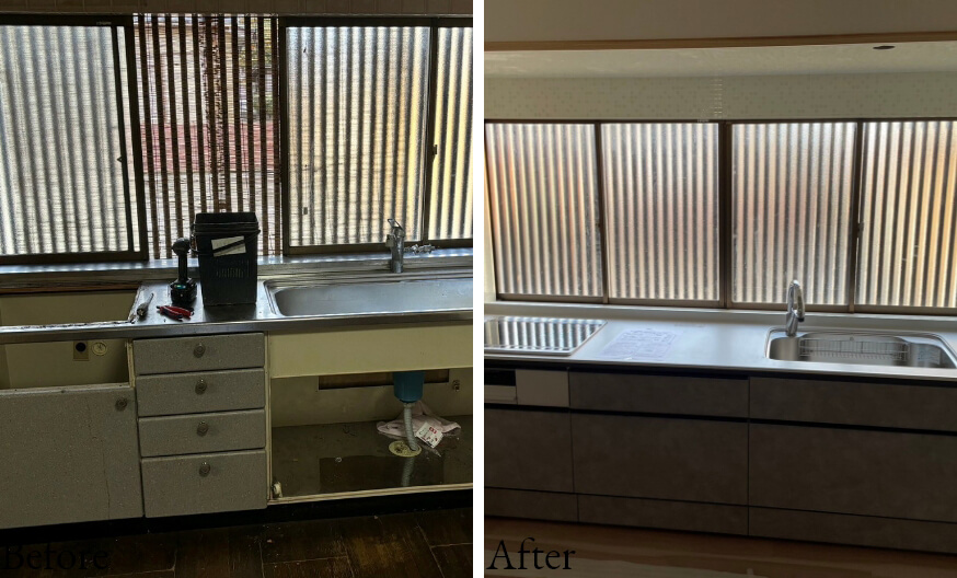 S様邸 キッチン改修工事水道工事のほか建築工事・電気工事含め自社のみで完結いたします。